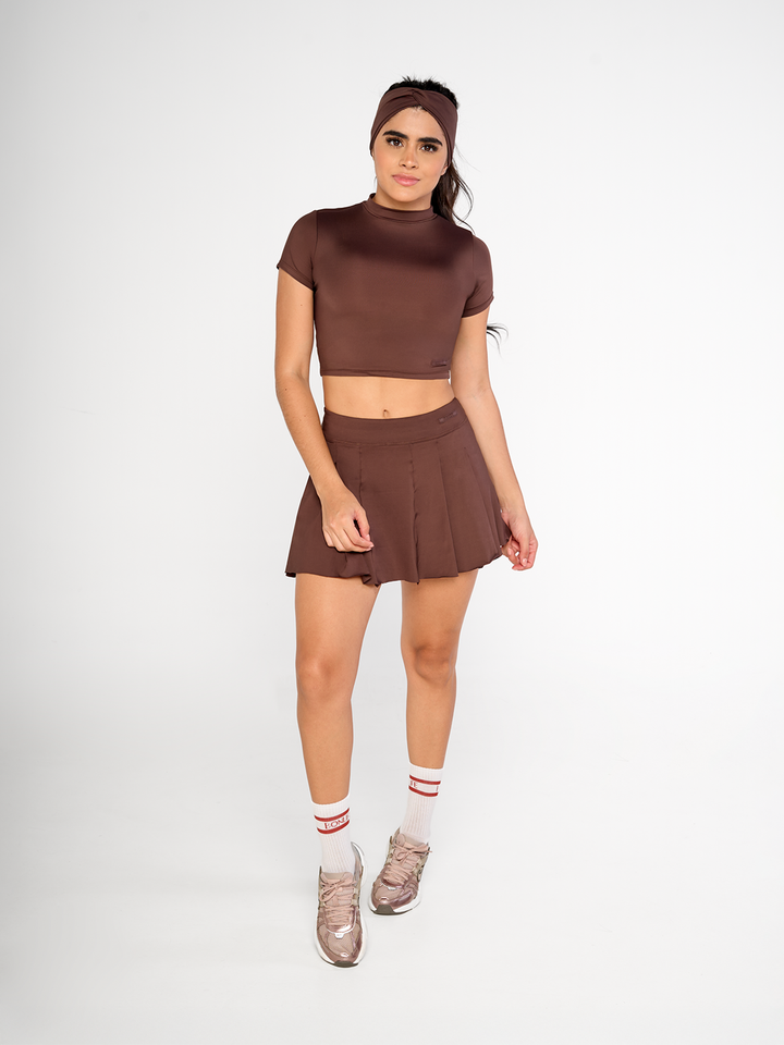 Blusa de manga corta con cuello alto y silueta ajustada. Tejido suave y elástico, aplique reflectivo moderno. Composición: 67% Nylon, 33% Spandex.
