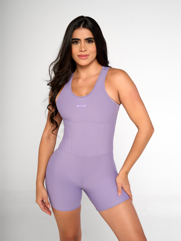 Enterizo short con control de abdomen, escote posterior profundo y corte tipo corpiño que favorece la silueta. Máxima elongación, suave al tacto y aplique PVC moderno.